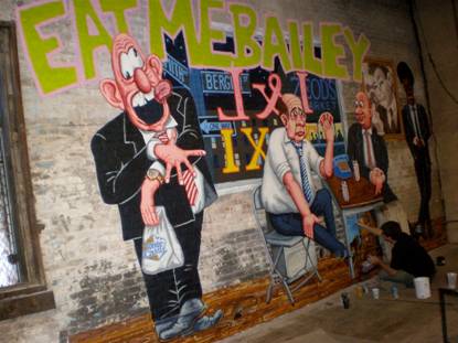 One of the featured artists, Tom Sanford, has created a site-specific (both location and subject matter) mural for the exhibition, called “L&L Taxi (Motherless Brooklyn)” based on Jonathan Lethem’s novel “Motherless Brooklyn” (1999). Sanford chose this subject matter because the Invisible Dog is located on the same block as the fictional L&L taxi / detective agency in Lethem’s novel (Bergen & Smith). The 12 x 22 ft mural imagines L&L in the present day, ten years after the story ends in the novel, with characters Lionel Essrog, Gilbert Coney, Loomis & Danny Fantl (left to right in the painting) still on Bergen street operating the L&L taxi service (no longer a detective agency) with a portrait of the departed Frank Minna on the wall in remembrance. The mural celebrates the history (albeit fictional) of Smith & Bergen, and honors one of Brooklyn’s many important contemporary authors.